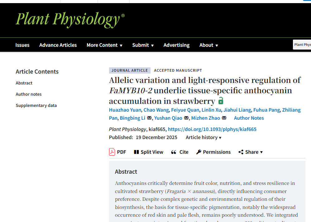 2025年12月19日,国际知名植物学期刊《Plant Physiology》在线发表了题为“Allelic Variation and Light-Responsive Regulation of FaMYB10-2 Underlie Tissue-Specific Anthocyanin Accumulation in Strawberry”的研究论文。通过对200个草莓品种开展系统性组学解析和基因功能验证,首次完整揭示了从关键转录因子变异、启动子结构差异到光信号响应通路的组织特异性花色苷积累调控网络,为精准改良草莓果实外观与营养品质提供了全新理论依据与分子靶标。